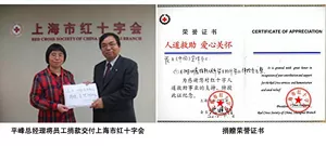 花王(中国)的全体员工向地震灾区捐款人民币79,743.00元。上海市红十字会赈济救护部滕桂香部长会见了平峰总经理,并接收了捐款。同时,向花王颁发了荣誉证书和荣誉奖章。