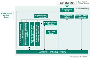 The overall execution of ESG has a governance structure with the ESG Managing Committee chaired by the Representative Director, President and Chief Executive Officer as the highest authority. The ESG Managing Committee, which consists of management, discusses and decides on the direction of activities related to the KLP, and reports the status of activities to the Board of Directors. In addition, the ESG External Advisory Board, which is comprised of outside experts, provides reports and recommendations in response to the consultations of the ESG Managing Committee, and reflects the third-party perspectives of outside directors and experts in management.