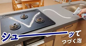 The area from the stove to the sink being sprayed all in one go with Kitchen Magiclean Foam Jet