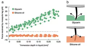 Force acting in the direction in which a negative value is drawn into the liquid (a). Force generated when glycerin and silicone oil are brought into contact (b). Schematic diagram of the meniscus shape to be formed (reference: modified from Iikura et al., Sci Rep 10, 14480 [2020]).