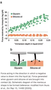 What effect does the wettability relationship between mosquito legs and liquids have on mosquito landing behavior? In the case of glycerin, which has low wettability on mosquito’s legs, the force when the legs come into contact with the liquid is zero, and the more you push it, the more repulsive is the generated force. However, in low-viscosity silicone oil, a strong attractive force (meniscus force) is immediately generated by the contact between the leg and the liquid (Fig.). That is, the mosquitoes that have settled on the surface of the silicone oil coating film have a strong attraction to the coating film through their legs. For example, if a total of four front and middle legs are accreted, and if the measured attractive force is applied to all four, the total value will be 4.96 μN. This is 87% of the gravity that mosquitoes produce, and this meniscus force is a non-negligible attraction for mosquitoes.