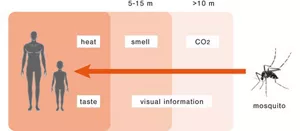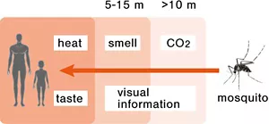 Mosquitoes detect CO2 at a distance of 10 m or more from humans and activate flight behavior. Mosquitoes then approach humans, relying on visual information and odors [1]. Eventually they detect heat and moisture and land on humans. After landing, their sense of taste detects human skin.