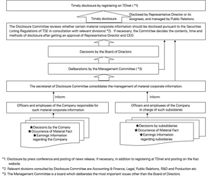 Kao has established a Disclosure Committee to set the Kao Group's regulations for disclosure, develop an organizational structure and determine the appropriateness of information to be disclosed. (Please refer to the chart attached hereto)