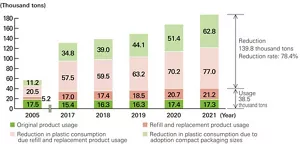One of Kao's Innovation in Reduction is promoting the use of refill and replacement packs. As of December 2021, Kao Corporation has 380 refill and replacement products, with a conversion rate of 83%. In addition, the amount of plastic reduced with refill and replacement products is 77,000 tons compared to the case where all products were made using their original product container. Combined with the effect of concentrated products, around 139,800 tons of plastic were reduced, making for a reduction rate of 78.4%.