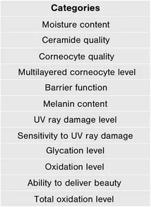 Using the two biological specimens of SSL-RNA and the stratum corneum, Skin Potential Analysis, Kao's most potent tool so far for precise skin analysis, aims to pinpoint what is happening in the skin at the time of analysis. Specifically, it analyzes 12 markers responsible for attractive skin (Figure 2), such as the skin's barrier function, sensitivity to UV rays, and glycation level. Results are compared to the average of the same age groups, giving customers information about their current skin condition.