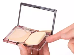 A concave mirror is attached to this cosmetics case for making up easily to a fine portion. The cover film is fixed in the case for missing prevention. The mechanism for lifting the sponge when opening the case, helps the user pick up and use the sponge more easily.