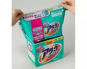 This is a refill for using the carton box and the spoon repeatedly. Kao proposed a repack way considering anti-scattering where the user puts the entire refill bag into the carton box. Every user can easily open it by cutting it along the perforation line with bare hands.