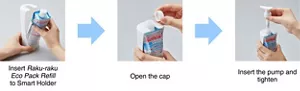 Install a refill package in 3 steps. We launched a holder specially made for Raku-raku Eco Pack Refill that allows people to use the content until the last bit.