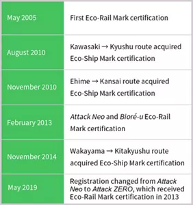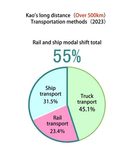 “Modal shift” is effective in reducing CO2 emissions by shifting transportation to mass transport, such as from trucks to rail and ship. In 1995, Kao switched to a full-scale modal shift, and since then we have maintained a high modal shift usage rate. For our efforts in rail transport usage, the Japanese Ministry of Land, Infrastructure and Transport selected Kao as an Eco-Rail Mark certified company at the first award certification meeting in 2005. Kao will continue to strive to increase its modal shift rate in order to reduce its CO2 emissions from an ESG perspective.