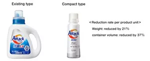 Powder laundry detergent Attack - launched in 1987 - is a prime example of such compact products. Compact laundry detergent has now become the mainstream product. Attack is 50% lighter and package volume 70% smaller compared with pre-compact detergents (on a per use basis). The compactification of products has made it possible to reduce plastic by more than 50,000 tons (as of December 2021).