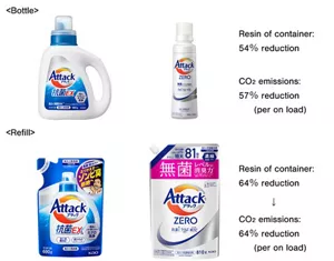 By boosting the performance of concentrated liquid laundry detergent Attack ZERO and reducing packaging size, we have been able to greatly reduce use of packaging material resources.