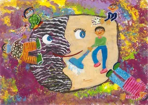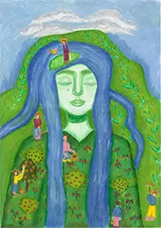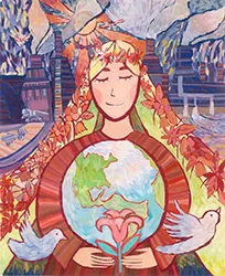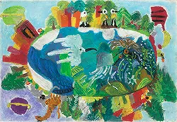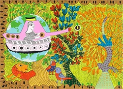 It is quite interesting that the earth in the center is drawn beyond the common sense. The work is excellent to express that the earth has feelings and emotion just like us. The use of colors and techniques are also elaborate, and the touch and coloring give us a strong passion into the work. This work shows the message to try working on the global environment issues positively.
