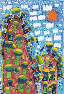 There are still many issues in the world that cannot be solved immediately. Even so, the painter expresses an earnest wish that every living thing holds each other’s hand and to build a peaceful world. It is remarkable to be expressed purely them as the painter’s honest wish through the eyes of a child.