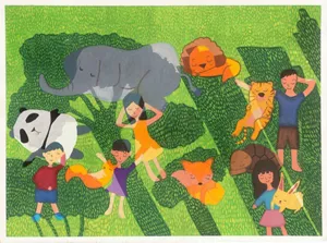 This work exactly depicts the concept of living in harmony with nature. The people and animals are lying down on the greenery with gentle expressions, and they all look truly comfortable. It expresses the message “coexisting with nature is a very happy thing” very well, and it makes our heart warm just looking at the work. It is finely depicted from the painter’s eye how important it is for humans and animals to be in the same place and share enjoyment together, as well how wonderful it is to spend time together.