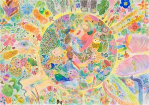 The soft, light brush strokes and the delicate colors are extremely beautiful. The center of the painting resembles the earth, the sun, or perhaps a flower. Inside this, we can find many different colors and objects from nature like humans, animals and plants. At the same time, it is totally harmonized. The work expresses dreams and hopes for how things should be, and it simply depicts a bright future. This work seems to fit a phrase “return to nature.”