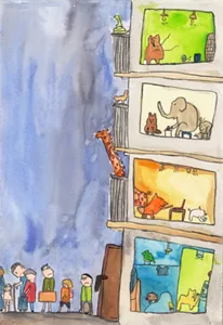 This work has a highly unique idea with animals inside the building and humans outside. This is an inversion of the regular relationship between humans and animals. Perhaps the humans may be displaced from their houses by the animals. They have an indescribable expression of a desire to return home. This is in fact what we humans are doing to animals, and the work ironically depicts the feelings of animals chased out of their homes. This work can serve as a starting point for thinking about the obvious, but highly important thing that the earth is not just for human beings.