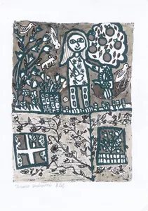 Despite being a block print with a monochromatic and extremely simple presentation, it spontaneously drew our attention. The painter draws themself on this work, with a tree in the garden and house with windows. The work simply shows that the painter really enjoys such ordinary daily life. It conveys a desire to live closely and in harmony with nature.