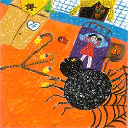 The vivid orange color is impressive and has the impact. The spider drawn large in the foreground is attractive, and perspective is expressed well. The painting evokes an atmosphere by pure expression based on the painter’s keen observation of elements in everyday life.