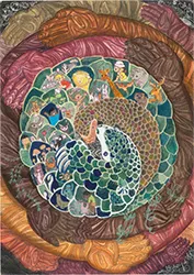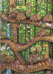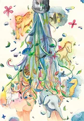 This work depicts a multi-layered world that is home for living things. The connections between each layer have been thought out carefully for the composition of the work. It resembles a mandala in some ways. The work is highly detailed, and it leaves a stronger impression the more we look at it.