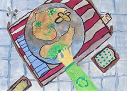 I have depicted two hands - human and natural. In the human hand there are people and garbage, and in the natural there are plants and animals. The human hand holds the universe, and the natural hand holds the sea. I drew this to show people that they can help make nature more sustainable by stopping polluting it.