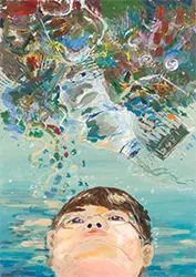 This work has a unique composition with a child imagining the feelings of marine life. The painting seems to depict the child going into the sea and witnessing that single piece of light plastic piles up together, then they can lie on as a heavy problem.