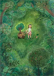 This work brings a tremendous power, almost breathtaking impact from the greenery. The painter’s passion moves our heart that a person tries to plant more despite plentiful enough greenery. The small pink flower nearby a girl’s foot serves as a good accent in the painting.