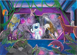 It seems showing the future that environmental issues in the earth get worse, and that a human goes to space for preserving species. The painter may convey a message that while space development is in progress, it would be better to allocate the technology and time more toward living things on the earth.