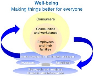 We will actively take excellent case studies and insight from among our many initiatives, and we will work to realize healthy and enriched lives by actively deliver these to employees and their families, to the local community, to workplaces, and to all consumers.