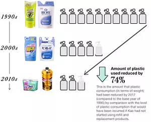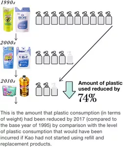 Kao develops refill packs and refillable products so that the original product containers can be reused. This proactive shift to refill packs has reduced Kao’s plastic consumption.