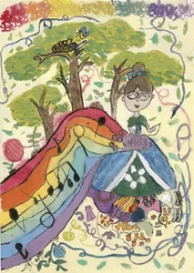 My mother always told me, “Donate your old clothes to people in need,” because when unsold clothes pile up, they harm the environment. I want to say, “Let’s donate old clothes and protect the Earth’s future.” The “Earth Girl” in this painting stands for the many types of used clothing. She is weaving a rainbow cloth to keep the forests and birds beautiful.