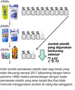 Kao mengembangkan kemasan isi ulang dan produk isi ulang sehingga kemasan produk asli bisa digunakan kembali. Pergeseran ke kemasan isi ulang ini telah mengurangi pemakaian plastik Kao.