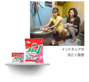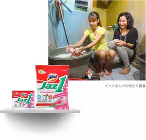 近年には、現地の生活スタイルに合わせた製品の開発を手がけるようになっています。 たとえば、2014年、インドネシアで発売した「アタック Jaz1」。多くの家庭が手洗いで洗たくを行なっている現状を踏まえ、現地の水は硬度が高く、衣類の汚れが落ちにくいという課題を解決するため、新技術を開発。優れた洗浄力を発揮する洗剤の開発に成功しました。