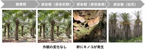 ガノデルマ*1 はガノデルマ属糸状菌の総称で、アブラヤシに感染すると、樹は水分伝達機能が阻害されるなどの影響で徐々に実の収量が低下し、やがて枯死します。パーム油の主要生産地であるインドネシアやマレーシアで被害拡大が問題となっていますが、現時点で有効な防除方法はなく、感染樹をなるべく早く発見し、伐採することが主な対処法です。一方で、感染の初期は目視での判別が難しく、判別できた時には、既に周囲に感染を広げてしまっているケースが多発しています(図1)。現在多くの農園では、スタッフが歩いて見回ることで病害の管理をしていますが、大きい農園では10万ヘクタール以上にもなるため、人件費の負担や専門家不足による診断精度低下も課題となっています。