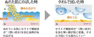 また、セラミド機能成分*1 (潤い成分)配合の濃厚なクリームが、肌表面の水分となじんでのびのよいローション状に変化し、潤いバリア膜が肌を密封します。タオルで拭いても*2 保湿成分がしっかり肌に残るので、全身膜で守られているような“潤い肌”が続き、肌を健やかに保ちます。
