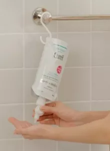 容器は、そのまま本体として使用する“つりさげパック”容器を採用。パックにそのまま、専用ノズル「らくらくスイッチ」を取り付けて、専用のフックで、お風呂場のタオル掛け等にかけてお使いいただくことが出来ます。