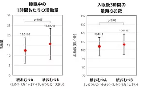 睡眠への影響を評価した結果、しめつけ力が小さい紙おむつAを着用したほうが、睡眠中の1時間あたりの活動量が少なくなり、入眠後3時間の最頻心拍数が低くなることもわかりました(図3)。子どもの睡眠中の活動量は睡眠が深いほど少なくなるため、深い睡眠が増加した可能性があります。また、入眠直後のノンレム睡眠*2 時と推定される期間の最頻心拍数が低いことは、交感神経系*3 の活動が低いことを示し、睡眠の質が良い状態であると考えられます。