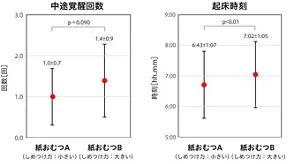 さらに、しめつけ力が小さい紙おむつAを着用したほうが、寝かしつけにかかる時間と中途覚醒回数が減少する傾向にあり、起床時刻が早くなることがわかりました(図4)。しっかりとした睡眠をとることができたため、起床時間が早くなった可能性があると考えられます。