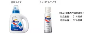 2019年4月には、衣料用濃縮液体洗剤「アタック ZERO」を発売しました。濃縮化によって製品の重量を削減し、容器の体積も小さくできるため、輸送時のCO2の削減にもつながります。「アタック ZERO」は従来型の液体洗剤「アタック抗菌EX」に比べ製品重量で21%、容器の体積で、37%削減されています。さらに、「アタック ZERO」は、洗浄基剤「バイオIOS」配合技術により、コンパクト化による環境負荷低減だけでなく、すすぎが1回で節水・節電によりご家庭での使用時のCO2排出削減にも貢献しています。