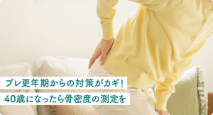 骨粗しょう症の予防のためにまず必要なことは、自分の骨密度を知ることです。できれば、女性ホルモンが急激に減る前に一度測っておくと、もともと骨密度が高めなのか、低めなのかがわかり、予防策が立てやすくなります。ですから、理想は「40歳になったら骨密度検査!」。