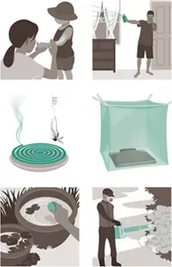 屋外でも蚊が産卵できるような水たまりや水桶を家の周りからなくすといった環境整備も重要です。場合によっては、貯水槽に殺ボウフラ剤(Larvicide)を使用して蚊の発生を防ぐこともあります。