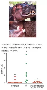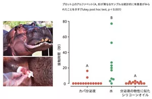 そこで、和歌山県のアドベンチャーワールドからカバの分泌液を入手し、分泌液の物性に近いシリコーンオイルを比較例として、それぞれを塗布した基板に蚊を止まらせる実験を行ないました。その結果、どちらの液体も蚊の降着抑制効果を持つことが明らかとなりました(図)。