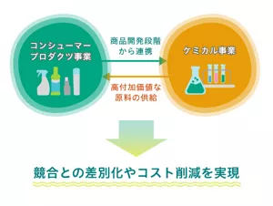 「花王がなぜケミカル事業を持っているのか?」これは多くの投資家からいただく質問です。ケミカル事業の売上高の約85%を占めるのは、社外のさまざまな企業への販売ですが、残りの約15%は社内のコンシューマープロダクツ事業への原料供給です。さまざまな産業界の顧客との取引で磨かれた高品質で高機能な原料をコンシューマープロダクツ製品に利用できること。それが他社との差別化やコスト削減の面で大きな効果を生み出しています。ひとつ例を挙げると、生理用品や紙おむつに使われている吸水性ポリマーは、ケミカル製品の開発の中から生まれた技術です。最近では、ケミカル事業で開発した廃PETをリサイクルした高耐久アスファルト改質剤が、コンシューマープロダクツ事業の顧客であるドラッグストアの駐車場の舗装に使用されるなど新しいコラボレーションも生まれています。日用品のグローバルメーカーがケミカル事業をも展開していることは非常にまれであり、花王の大きな強みのひとつとなっています。