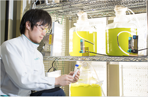 バイオマスのひとつとして着目しているのが「藻類」。「藻類」から採取できる油の量は同面積あたりで比較するとヤシの10倍以上といわれています。