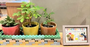 回収容器から再生したプラスチック鉢を利用して店内フードコートにミニ観葉植物を設置