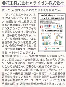 花王株式会社(社長・長谷部佳宏)とライオン株式会社(社長・掬川正純)、株式会社イトーヨーカ堂(社長・山本哲也)は、プラスチック包装容器資源循環型社会の実現に向けて、東京都墨田区* にあるイトーヨーカドー曳舟店において使用済みつめかえパック(以下、フィルム容器という)の分別回収実証実験を行なっています。