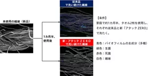 花王株式会社(社長・長谷部佳宏)は、2022年5月14日、衣料用濃縮液体洗剤「アタック ZERO(ゼロ)」を改良新発売します。ニオイ菌などの隠れ家となっていた「バイオフィルム」が繊維の中に存在することを発見。また、この「バイオフィルム」は、これまで除菌洗剤や漂白剤*2 では落とせていなかったこともわかりました。新しくなった「アタック ZERO」は、パワーアップした洗浄力と新処方により、ニオイや黒ずみの発生源となる手強い“菌の隠れ家”にまでアプローチ*1 します。