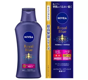 | ニベア ロイヤルブルーボディミルク エイジングケア*1 。大人のための最高保湿シリーズ*2 ボディミルク。 角層細胞まで豊潤保湿。夜のケアで翌朝までうるおい続く |