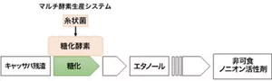 熱帯から亜熱帯で多く栽培されるイモ類であるキャッサバ(図1)は、根茎部分からデンプンを抽出した後に非可食の残渣が発生します。花王は、タイで大量に発生しているキャッサバ残渣に着目。30年以上にわたって培ってきた洗剤用酵素の知見を活用し、キャッサバ残渣中の糖の分解に最適な酵素(糖化酵素)を開発しています。また、糸状菌を用いて複数種類の酵素を同時に生産する技術も応用することで、キャッサバ残渣の分解に必要な複数の酵素をひとつの設備だけで製造する方法(マルチ酵素生産システム)を開発し、簡便に糖に分解できることを確認しています(図2)*2 。