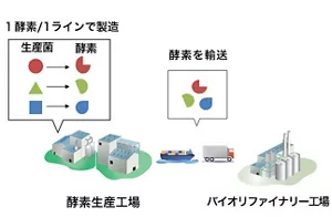 バイオマス利用に必要な糖化酵素は、バイオマスを加工してケミカル製品を生産するバイオリファイナリー工場まで船やトラックで輸送されるのが一般的です(図3)。しかし、マルチ酵素生産システムによって酵素生産設備をコンパクトにすることができると、同じ工場の敷地内で酵素を生産し、ダイレクトに供給を行なうシステム(オンサイト生産システム)が可能になります(図4)。花王は、独自のオンサイト生産システムを新しい製造モデルとして提案しています。オンサイト生産システムでは、輸送コストやCO2排出を抑制でき、さらに、サプライチェーン上での不測のリスクを回避するといった事業化にあたってのメリットが多くあります。