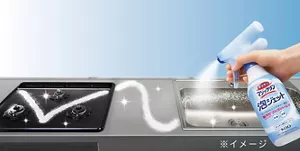 そこで、コンロからシンクまで、日々のキッチン掃除をラクに・早く・楽しくできる『キッチンマジックリン 泡ジェット』を新発売します。シューッと泡を続けて出せるスプレーの採用により、適量を薄く広げられるので、スプレー後の洗剤を広げる手間を省けます。また、サッとふくだけ・シンクは流すだけで汚れを落とせ、毎日の油汚れはゴシゴシいらず。さらに、汚れを落としやすくするバリアコート機能*1 により、次の掃除がラクになります。